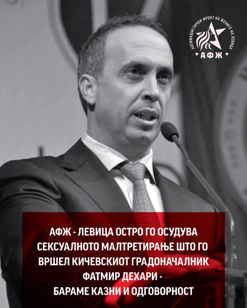 Антифашистичкиот фронт на жените, АФЖ – Левица, најостро го осудува одвратното, мизогино и злоупотребувачко однесување на Фатмир Дехари, градоначалник на Кичево, како и срамното молчење од страна на ДУИ и останатите институции.