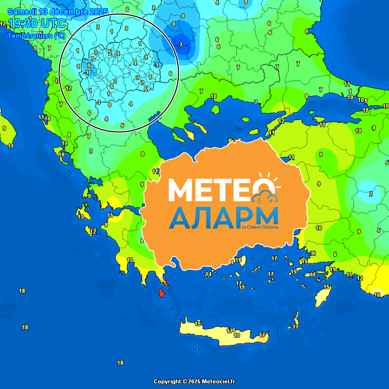 Територијата на Македонија останува да биде под влијание на висок воздушен притисок (Антициклон) кој се протега од југ и зафаќа најголем дел од Европскиот Континент и целиот Балкан. Вечерва во Македонија насекаде имаме ведро и ладно време со температури близу 0 степени а веќе особено во повисоките населени места и на планините температурата се спушта под нулата и има појава на слана и на мраз.