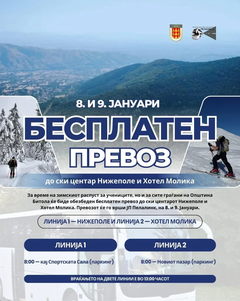 Општина Битола, во соработка со јавното претпријатие „Пелалинк“, и оваа зима ќе обезбеди бесплатен превоз до ски центрите на Баба Планина, како за учениците, така и за сите граѓани. „На 8 и 9 јануари (четврток и петок) бесплатно можете да одите до ски центрите кај Нижеполе и кај хотелот „Молика“ и да уживате во убавините на планината“, соопшти Општината.