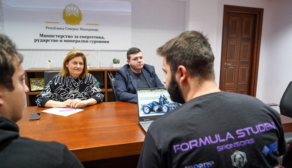 Министерката за енергетика, рударство и минерални суровини оствари работна средба со студентите инженери од проектот „Македонска Формула“. Тимот MES Racing – првиот и единствен македонски Formula Student тим, кој успешно ја претставува државата на меѓународната инженерска и технолошка сцена.