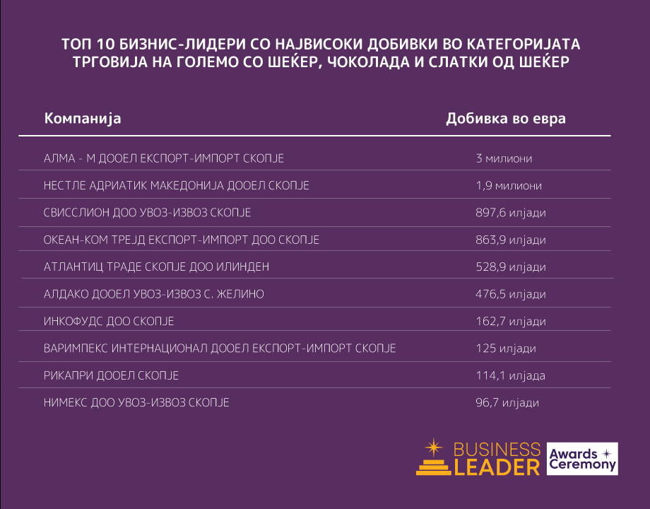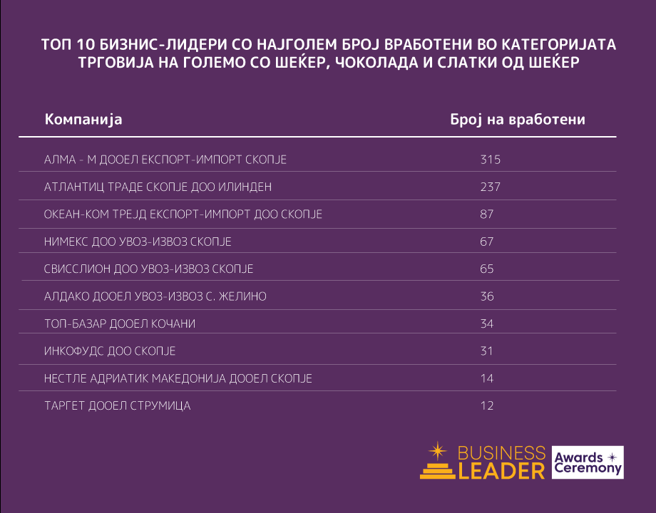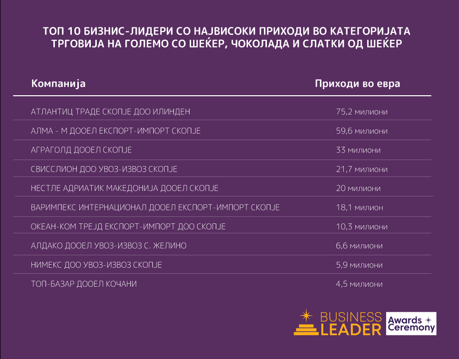 Рангираните десет компании покриваат најголем дел од дистрибуцијата на брендови за слатки и кондиторски производи во Македонија.