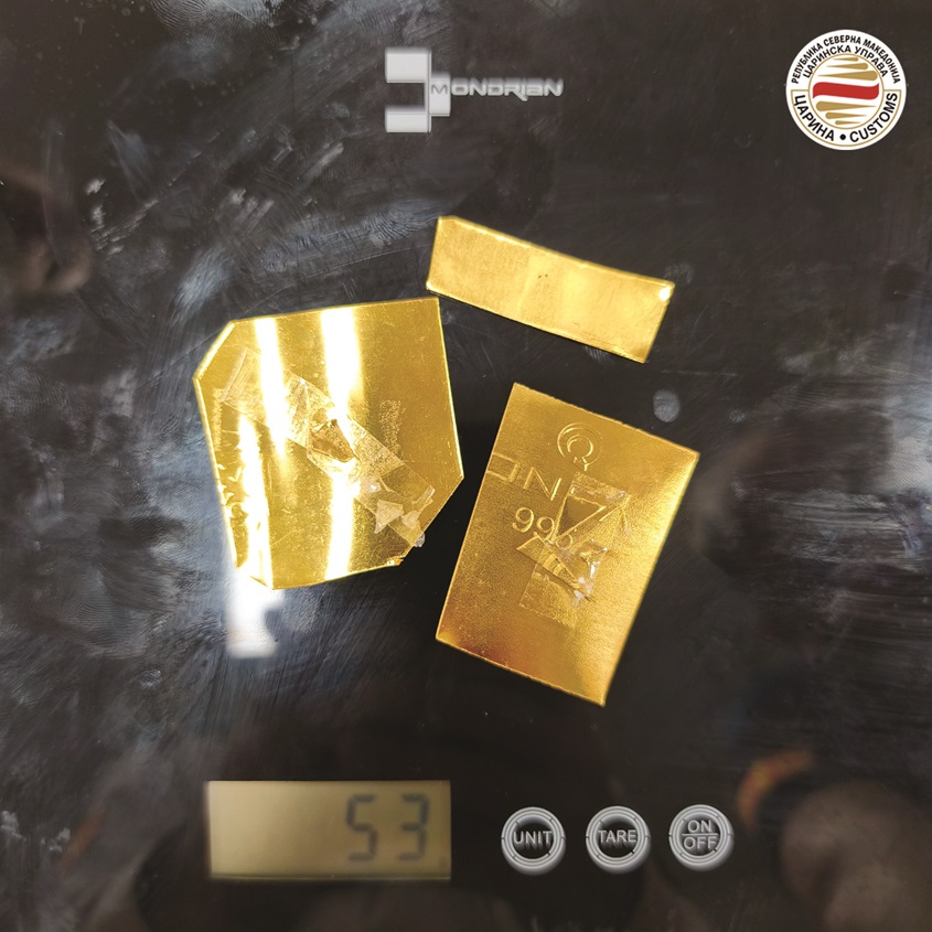 - Златни плочки со тежина од 53 грама и 11 златни монети со тежина од 39 грама се пронајдени при контрола на багаж на турски државјанин на излез од државата, на граничен премин Меѓународен Аеродром Скопје. Проценетата вредност на златото изнесува 538 илјади денари.