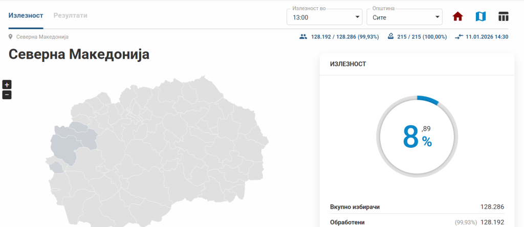 До 13.00 часот гласале 8,89 отсто од запишаните избирачи во избирачкиот систем во четирите општини каде денеска се одржуваат повторените избори.