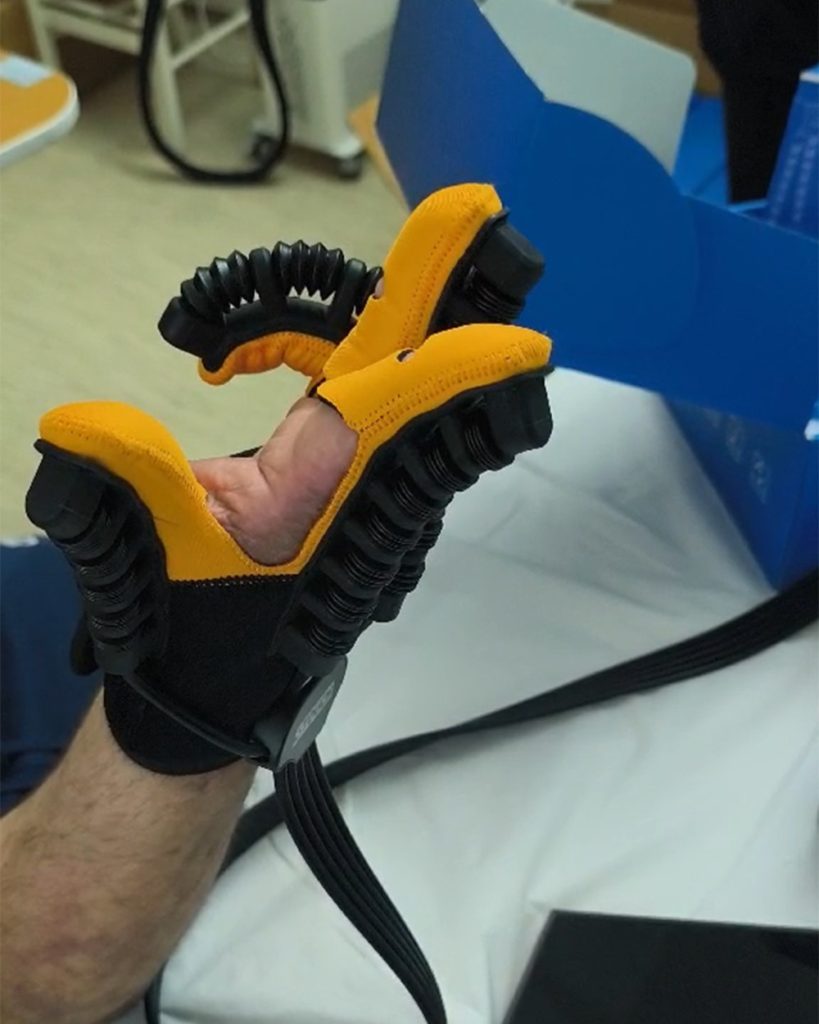 Секој комплет се состои од терапевтска ракавица, контролер и клон ракавица и претставува современо технолошко решение за спроведување на пасивни рехабилитациски третмани кај пациенти со нарушена моторика на горните екстремитети, како резултат на изгореници, повреди или невролошки состојби.