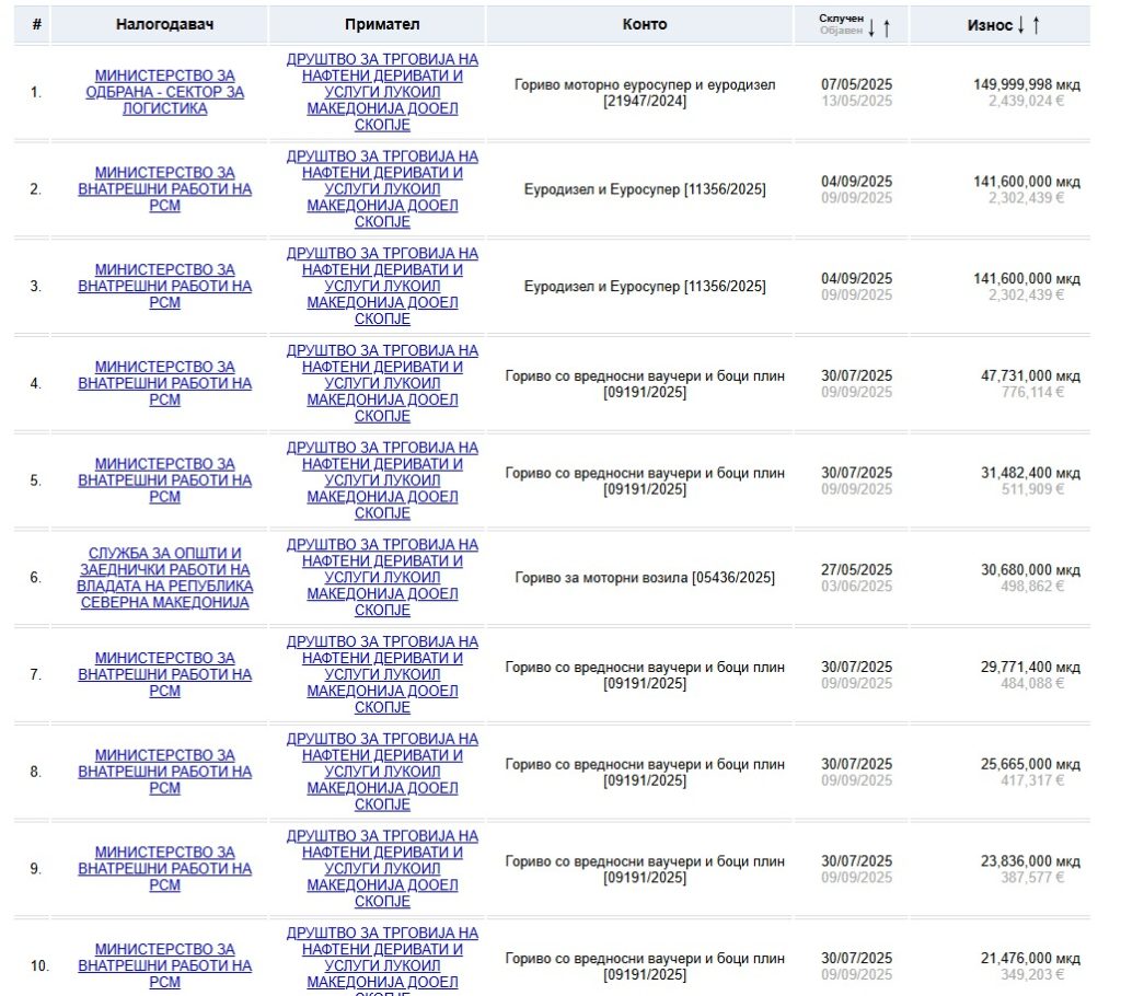 Дополнителна тежина на случајот му дава и фактот што, според јавно достапните податоци на Бирото за јавни набавки, „Лукоил Македонија“ во текот на 2025 година од државни институции добила јавни набавки во вкупна вредност од околу 10 милиони евра. Овие бројки покажуваат дека компанијата била значаен и чест снабдувач на државниот сектор, и тоа во период кога веќе постоеле сериозни меѓународни ограничувања и санкциски ризици поврзани со компанијата.