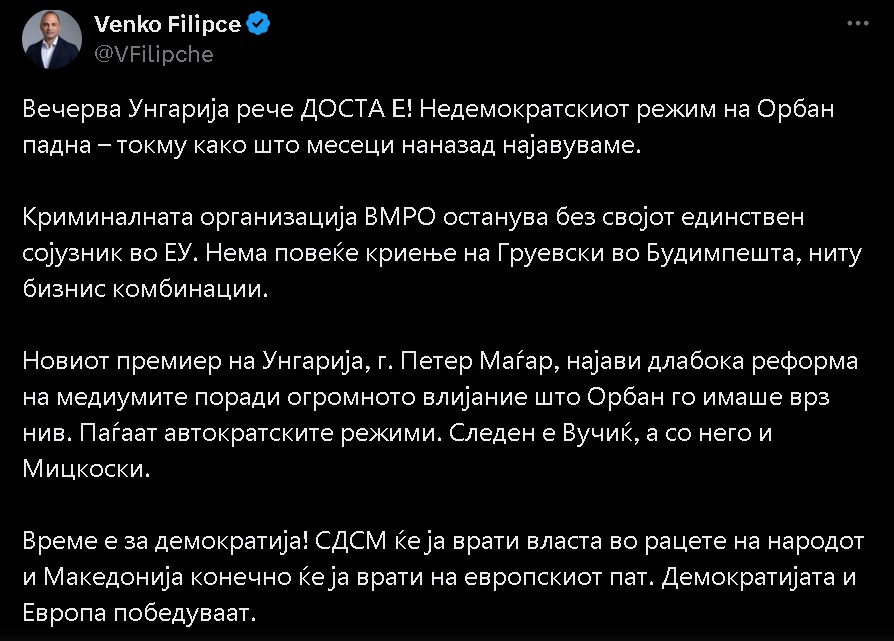Криминалната организација ВМРО останува без својот единствен сојузник во ЕУ. Нема повеќе криење на Груевски во Будимпешта, ниту бизнис комбинации. Новиот премиер на Унгарија, г. Петер Маѓар, најави длабока реформа на медиумите поради огромното влијание што Орбан го имаше врз нив. Паѓаат автократските режими. Следен е Вучиќ а со него и Мицкоски. Време е за демократија! СДСМ ќе ја врати власта во рацете на народот и Македонија конечно ќе ја врати на европскиот пат. Демократијата и Европа победуваат.”