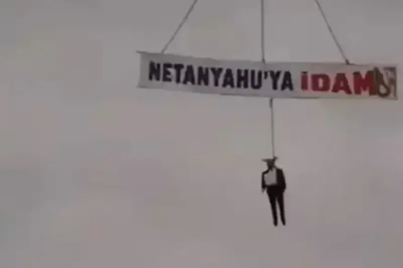 Фотографиите објавени од турскиот провладини весник „Јени Сафак“ покажуваат кукла како виси од кран во градот Трабзон на Црното Море. Над неа, на постер пишува „Смртна казна за Нетанјаху“.