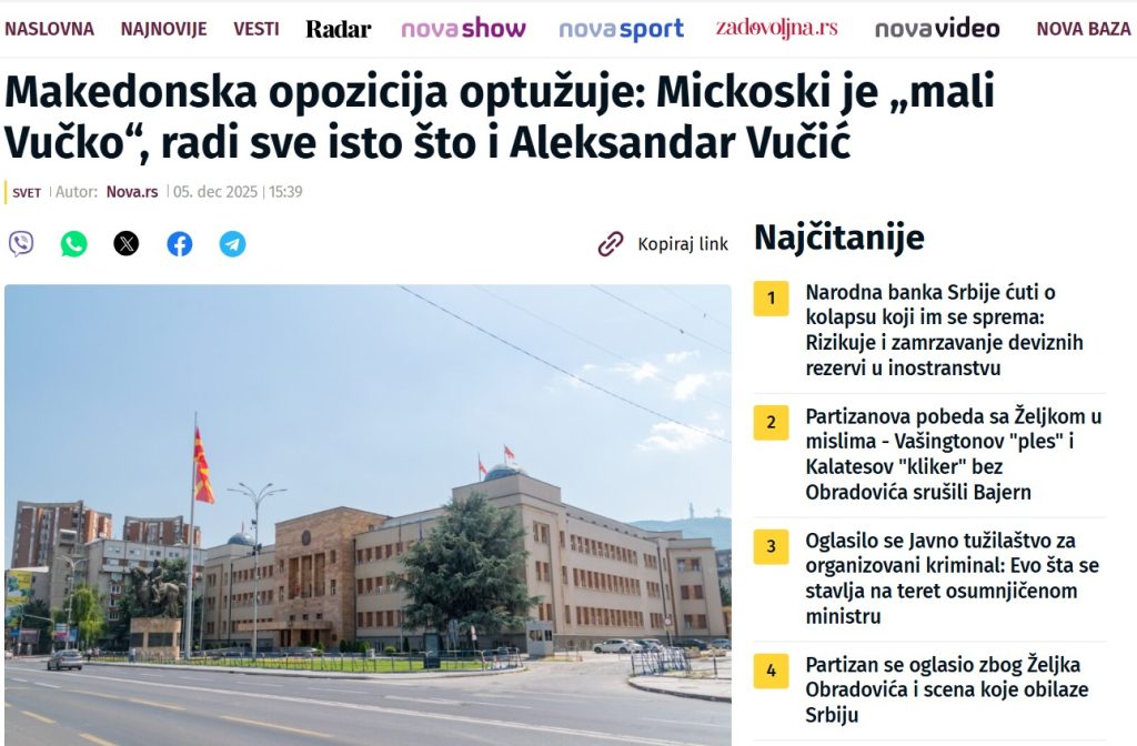 Со објавувањето на текстот „Македонска опозиција обвинува: Мицкоски е ‘мал Вучко’, прави сè исто што и Александар Вучиќ“, српските медиуми фактички ја пренесуваат домашната партиска полемика во регионален контекст. Внатрешниот македонски судир околу моделот на владеење, корупцијата и изборите така станува дел и од српската медиумска сцена, каде што балканските политички паралели и споредби одамна се дел од дневната агенда.
