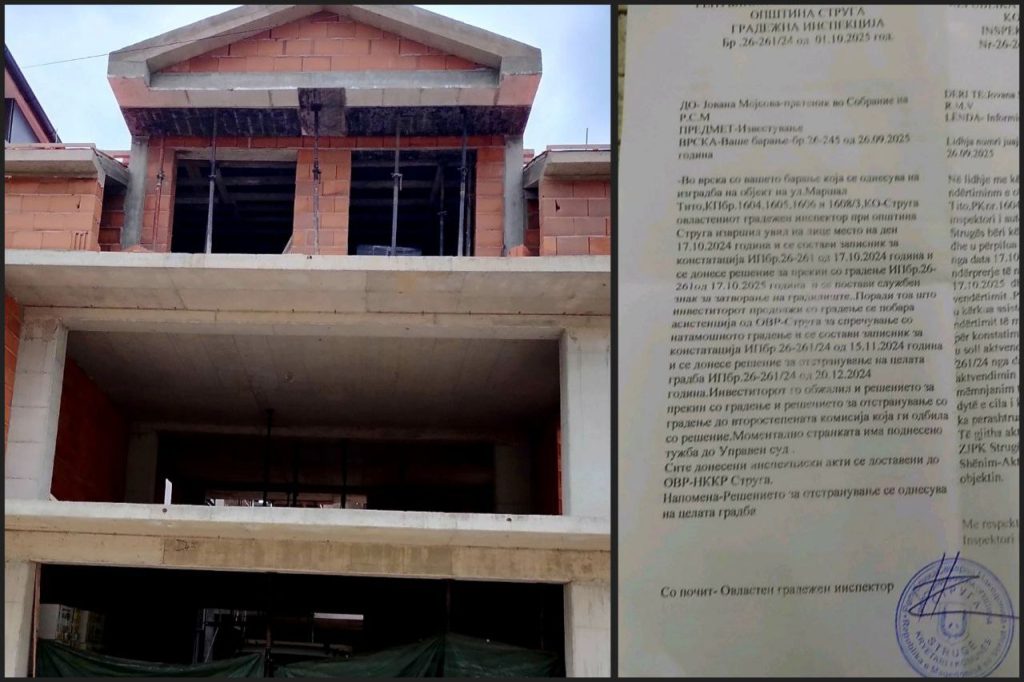 Но, и покрај овие формалности, фактичката состојба е дека секој ден дивоградбата се доградува и работници секојдневно работат на овој објект. Најповикан орган за постапување за овој криминал во центарот на градот е ЈО Струга и затоа, ќе ги искористам сите механизми за да добијам одговор кој е јавниот обвинител кој го штити дивеењето на градежната мафија во центарот на Струга.