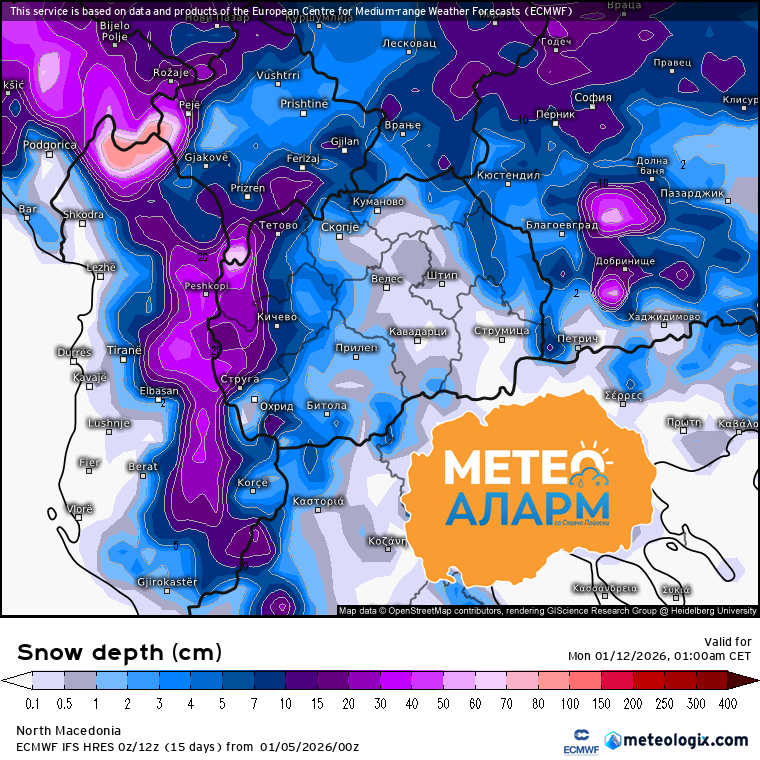 Повеќе врнежи ќе има во западните предели каде на повисоките населени и планински места ќе се формира позначителна снежна покривка (Над 20/30 сантиметри) а во градовите во западна Македонија ќе се формира снежна поркивка од 5 до 10 сантиметри, локално и над 15 сантиметри. Во Пелагониско ќе се формира снежна покривка 2 до 5 сантиметри а во источните и во североисточните предели таа ќе биде малку поголема и локално ќе се формира снежна покривка со висина од 5 до 10 сантиметри. Без снег и снежна покривка ќе останат централните и југоисточните предели од Македонија.