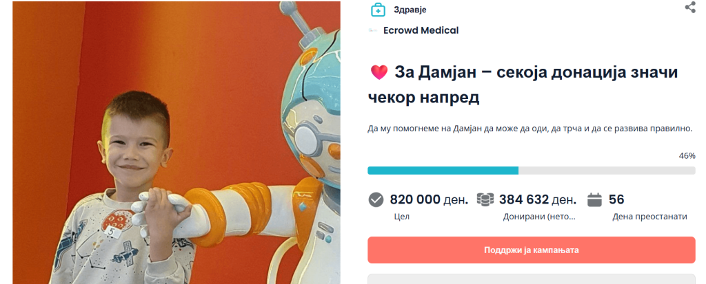 Дамјан е 5-годишно детенце кое многу сака да оди во градинка и да се дружи, игра и трча со другарчињата. Роден е со ригиден еквиноварус на левото стапало и до сега се поминати 2 неуспешни операции на ногата за да дојде до одредена форма и развој. За жал, оваа состојба го атрофира мускулот на левата нога и го скратува стапалото за цел број, што му прави дополнителни проблеми во одењето, трчањето, возењето велосипед…