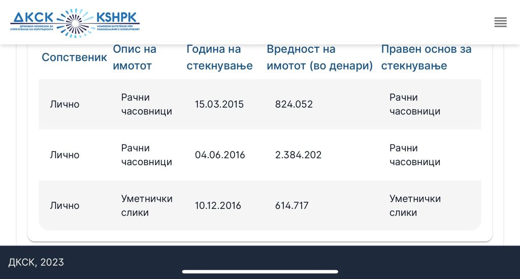Согласно анкетниот лист за имотната состојба, Мицкоски има колекција од часовници вредни 60.000 евра.