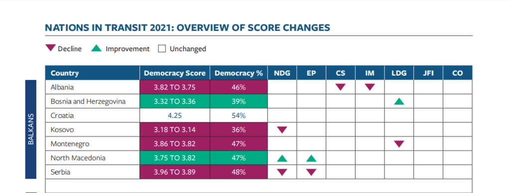 Ако се спореди со времето на СДСМ, во 2021 година Македонија беше прва во регионот, единствената земја со демократски напредок во Западен Балкан односно со втор најдобар резултат во Европа.