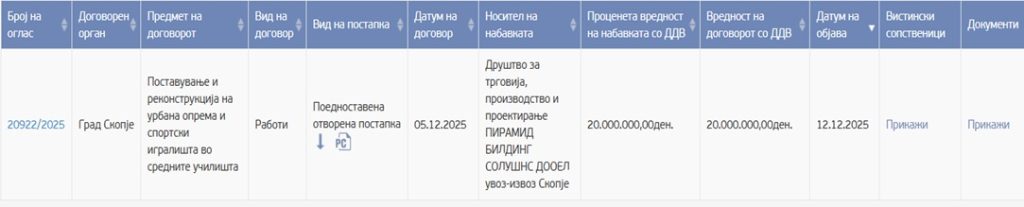 20 милиони денари е тендерот за Пирамид Билдинг со склучен договор на 05.12.2026 година.