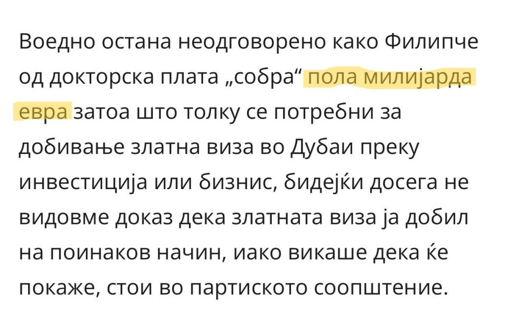 Од многу лажење поскапе и „визата“. Вчера велеа половина милион долари чинела, денеска не е веќе половина милиони, стана половина милијарда, денеска не се долари, станаа евра.