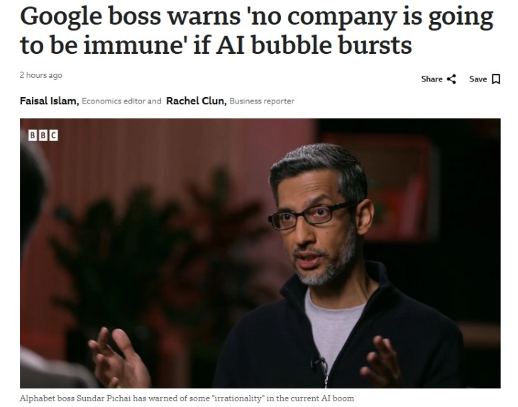 Во ексклузивно интервју за Би-би-си Њуз, Сундар Пичаи рече дека иако растот на инвестициите во вештачката интелигенција (ВИ) бил „екстраординарен момент“, во сегашниот бум на ВИ има одредена „ирационалност“.