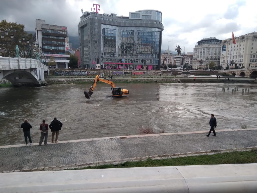 Екипа на 24 Инфо денеска забележа багер како влегува во коритото на реката Вардар, каде што се изведува чистење на насобраниот отпад и нанос, со што се подобрува протокот на водата и изгледот на самата река.
