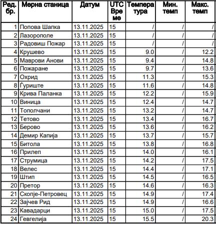 Денешниот ден (четврток 13 ноември) во нашата Македонија помина во знакот на сончев и релативно топол ден со температури кои беа над просекот за месец ноември. Дуваше слаб ветер претежно од јужен правец.