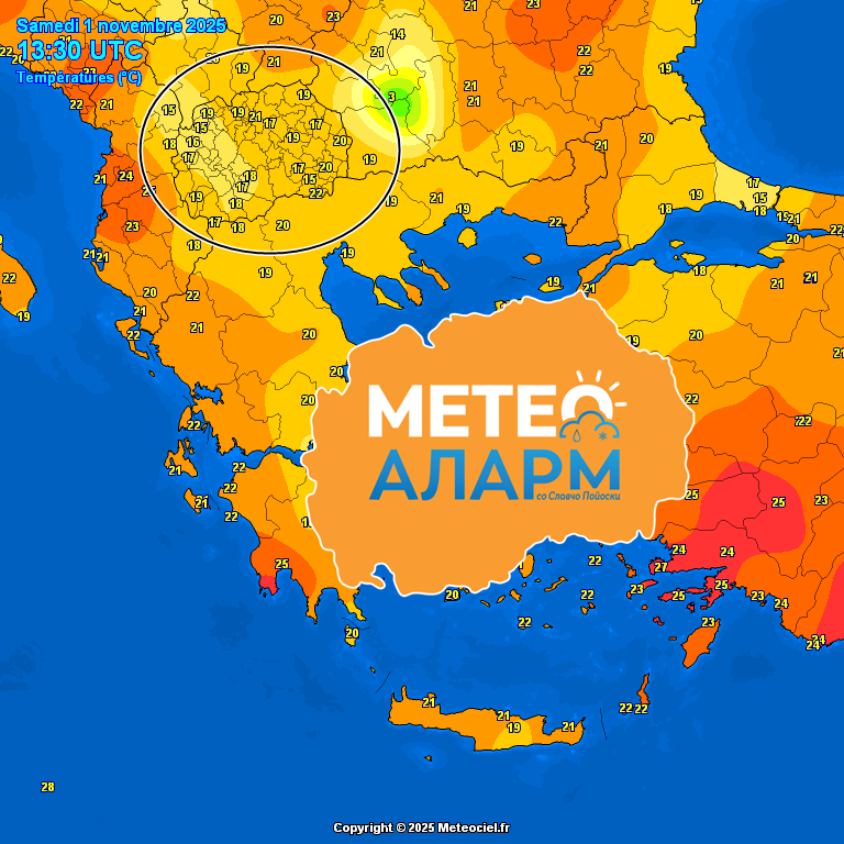 На метеоролошката карта можете да ги видите температурите измерени попладнево во нашата Македонија. Може да се види дека најтопло е во Гевгелија со измерени 22 степени.