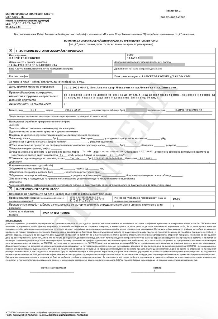 Според записникот, прекршокот е направен на булеварот „Александар Македонски“ во правец од Ченто кон Хиподром во 9:42 часот утринава.