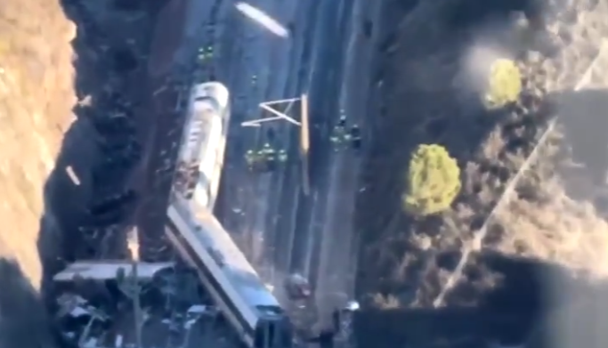 Местото на несреќата каде вчера вечер се судрија два воза во Шпанија е снимено од хеликоптер утрово. Цивилната гарда продолжува да го проверува подрачјето каде што се случила железничката несреќа во Адамуз, користејќи ги сите расположиви ресурси, вклучително и хеликоптери.