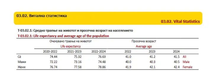Очекуваната должина на животот при раѓање бележи раст од 1,3 години, споредено со периодот 2021-2023 година кога изнесувал 75,32 години и 2,2 години споредено со периодот 2020-2022 година.