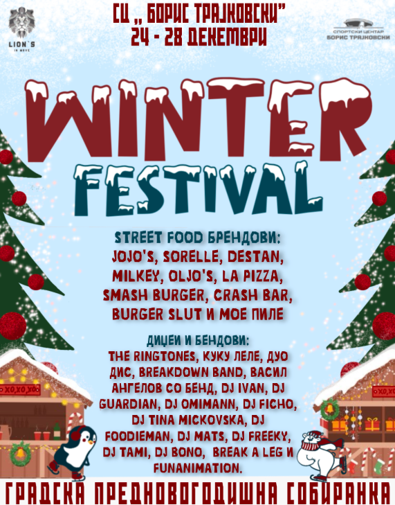 Од 24 до 28 декември, просторот пред СЦ „Борис Трајковски“ ќе се претвори во вистинска празнична сцена исполнета со вкусна улична храна, богата музичка програма и зимска атмосфера за сите генерации. WINTERFESTIVAL носи градска предновогодишна дружба каква што Скопје одамна посакува.